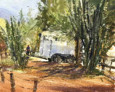 I always like to use my Virtual Paintout pieces to work on improving my watercolors. When I started using gouache, I began with paintings for the Virtual Paintout. Everywhere I looked this month the overloaded utility poles caught my eye so those were fun to include. Previously, I only recall seeing so many wires in a city in South America. It's always fun for me to virtually visit new places.